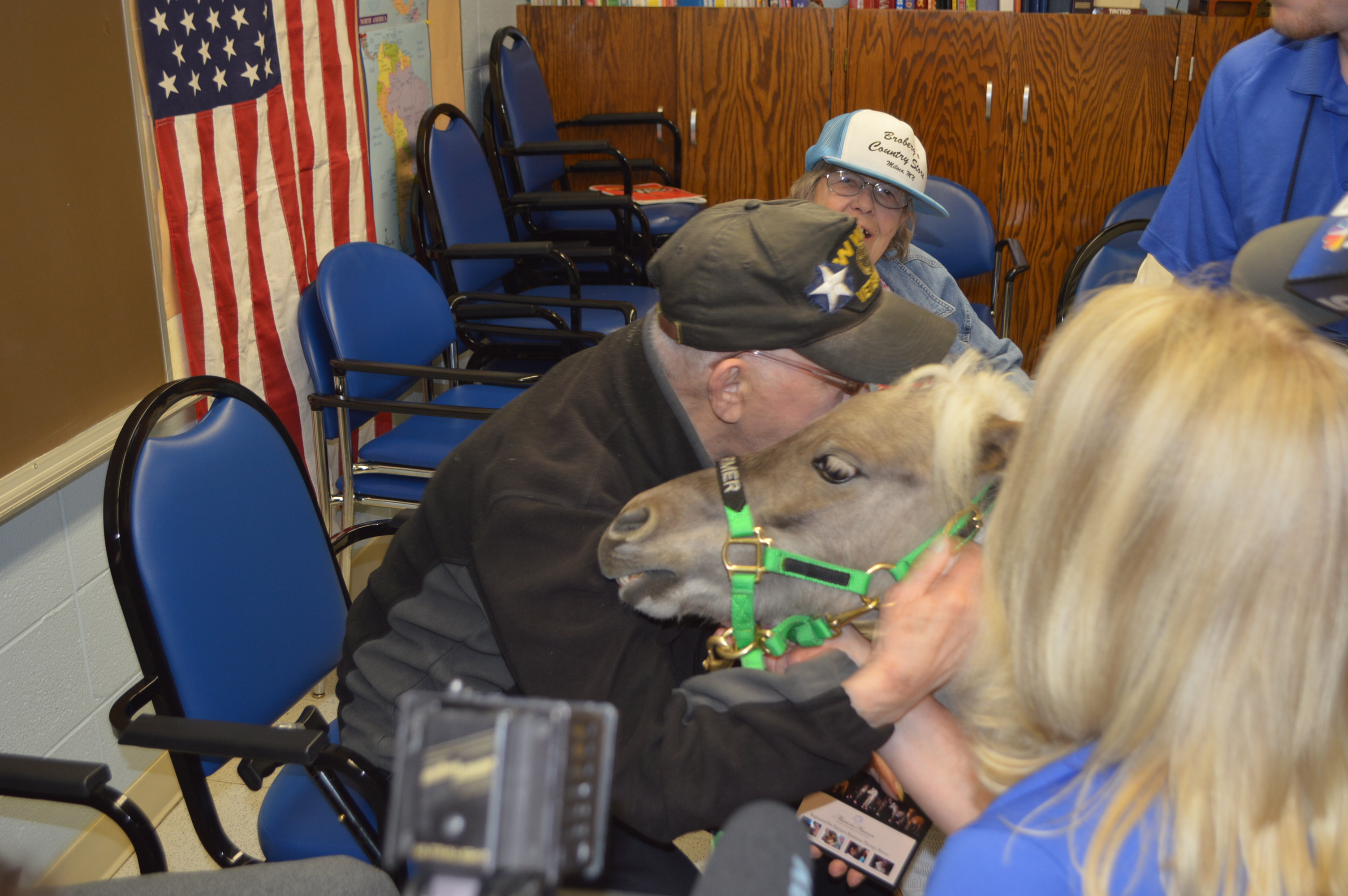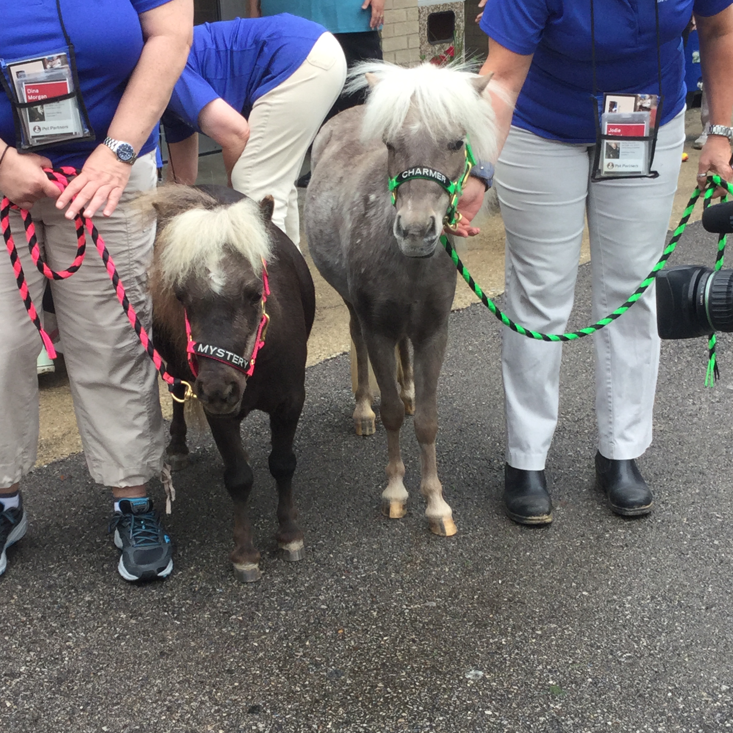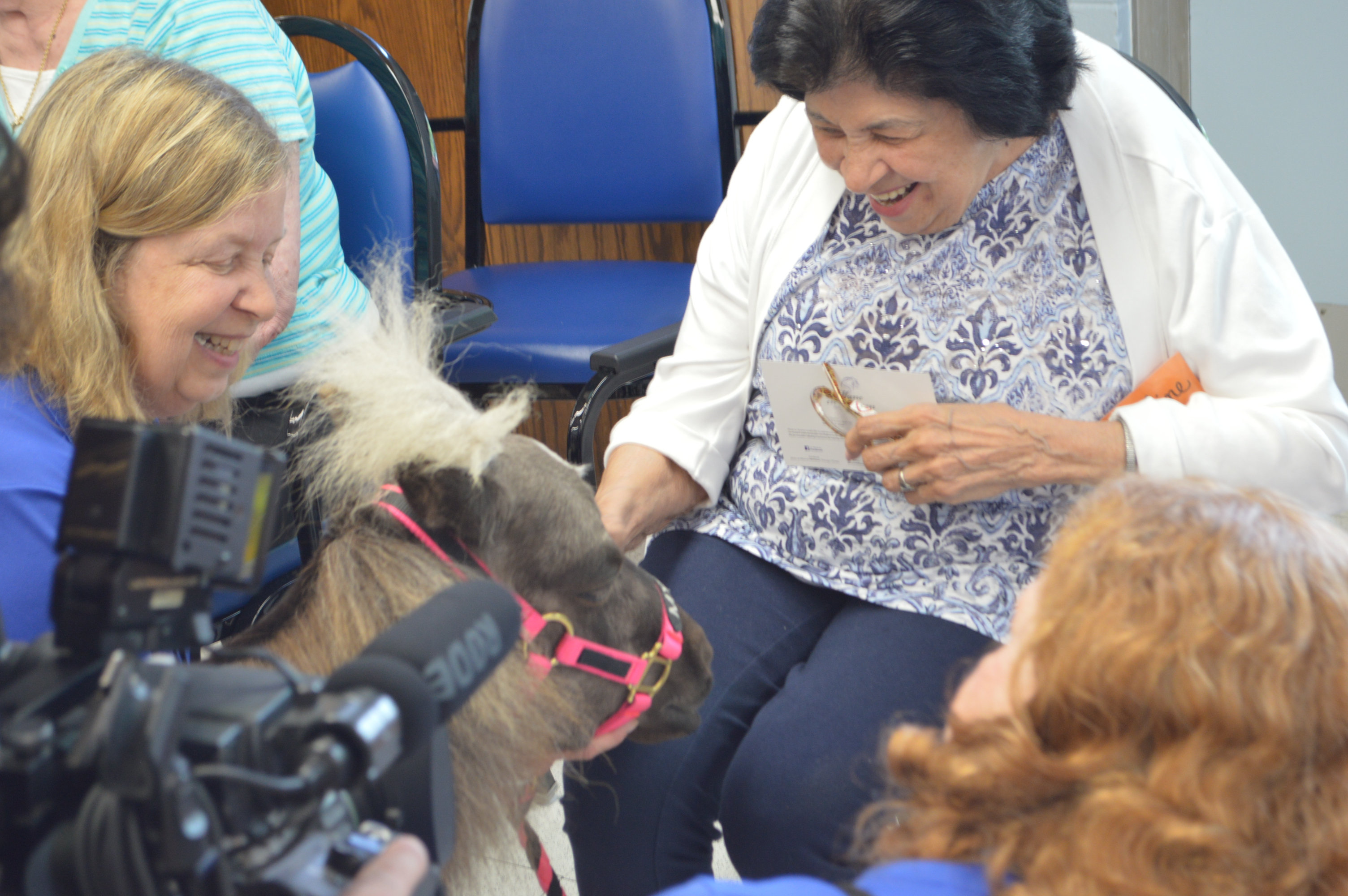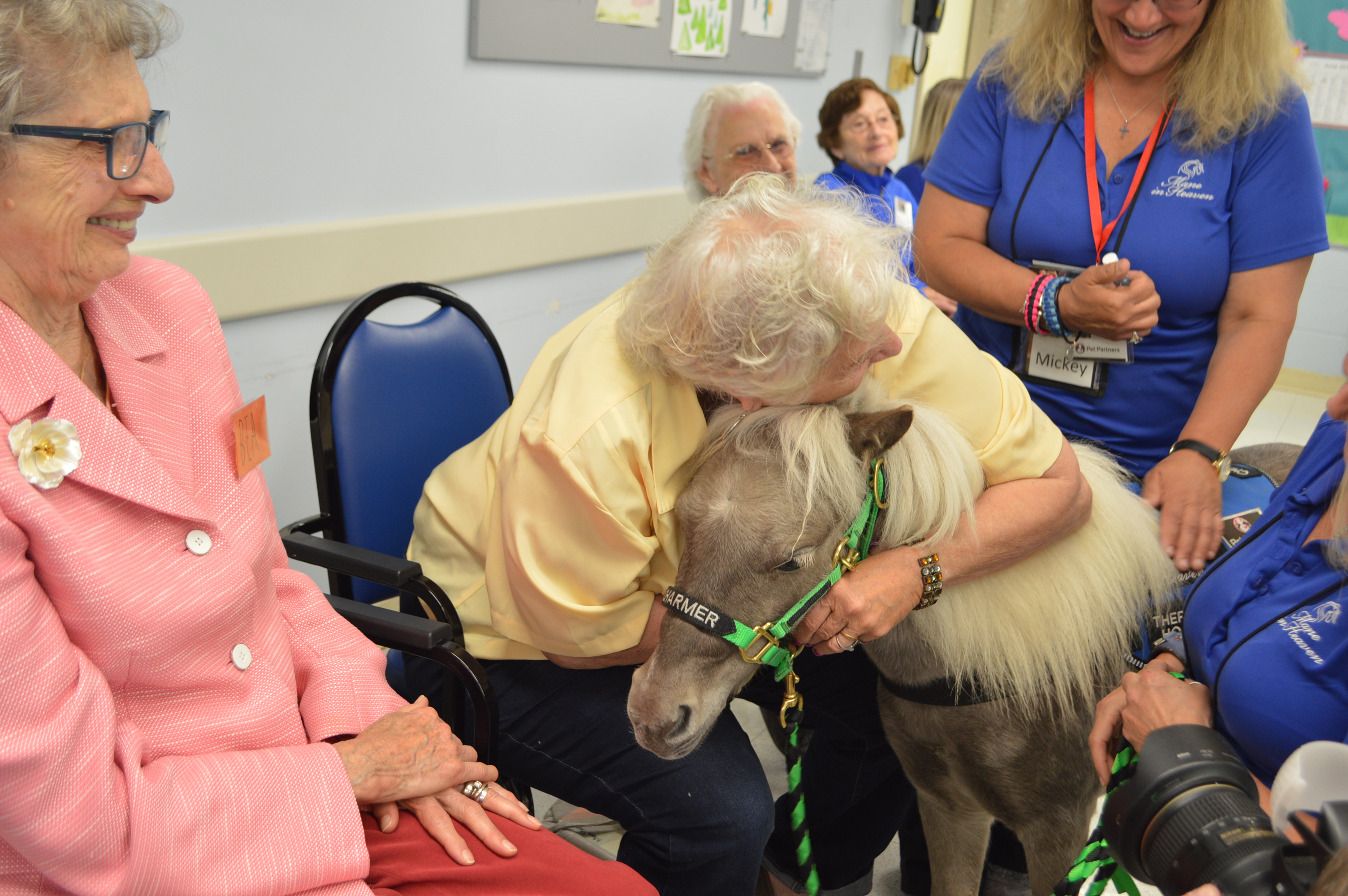 The miniature horses are registered through Pet Partners, nationally recognized as the pioneer of animal-assisted therapy. The “minis” are specially trained and have passed extensive testing to provide comfort and healing to those in need, much like traditional therapy dogs. When they came to visit, the horses were wearing their own gym shoes, provided by their sneaker sponsor, Teddy Mountain. The footwear helps steady the horses and prevent slipping on inside floors and hallways. The miniature horses, acting on commands, brought huge smiles, laughter and love to the participants. They received lots of hugs and kisses as they met their admirers.